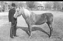 Edward Kimball is standing in front of the Upper Common and holding his horses head. Bandstand and First Parish Church in the background. Roads are dirt.