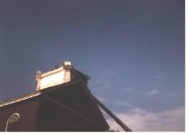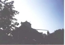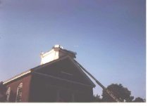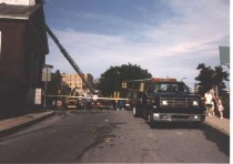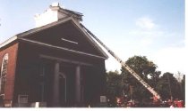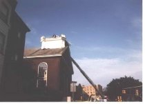 Fire department ladder hoisted to the roof of First Parish Church after the microburst of 1989.
