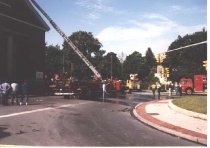 Fire trucks at scene of the damage to the First Parish Church steeple caused by the microburst in spring of 1989.